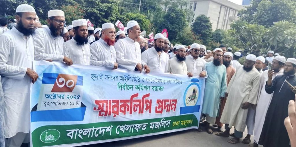 জুলাই সনদের আইনি ভিত্তি ও অবিলম্বে গণভোট আয়োজনসহ পাঁচ দফা দাবিতে আজ বৃহস্পতিবার (৩০ অক্টোবর) নির্বাচন কমিশন বরাবর স্মারকলিপি প্রদান করেছে বাংলাদেশ খেলাফত মজলিস। দলের মহাসচিব মাওলানা জালালুদ্দীন আহমদের নেতৃত্বে একটি প্রতিনিধি দল নির্বাচন কমিশন কার্যালয়ে প্রধান নির্বাচন কমিশনারের (সিইসি) সঙ্গে সাক্ষাৎ করে স্মারকলিপি প্রদান করেন। প্রধান নির্বাচন কমিশনার প্রতিনিধি দলকে আন্তরিকভাবে স্বাগত জানান।