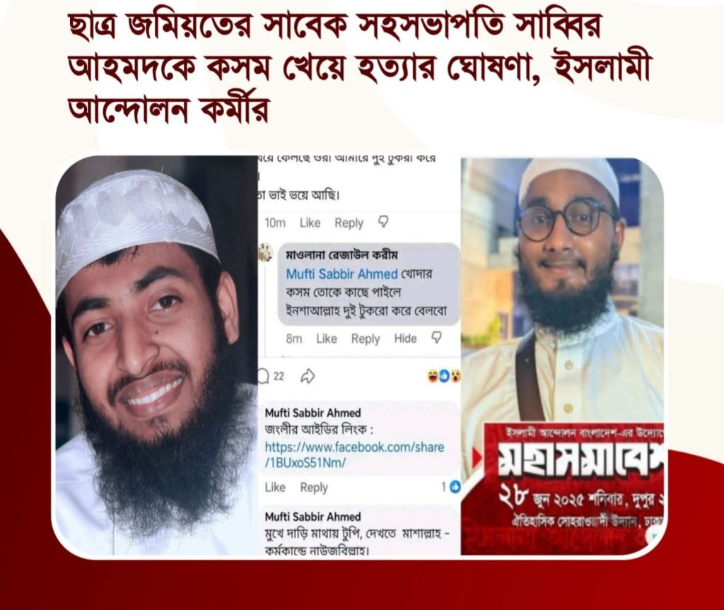আজ মুফতি সাব্বির আহমেদের একটি ফেসবুক পোস্টের কমেন্টে ইসলামী আন্দোলনের কর্মী মাওলানা রেজাউল করিম লেখে “খোদার কসম তোকে কাছে পাইলে ইনশাআল্লাহ দুই টুকরা করে বেলবো”