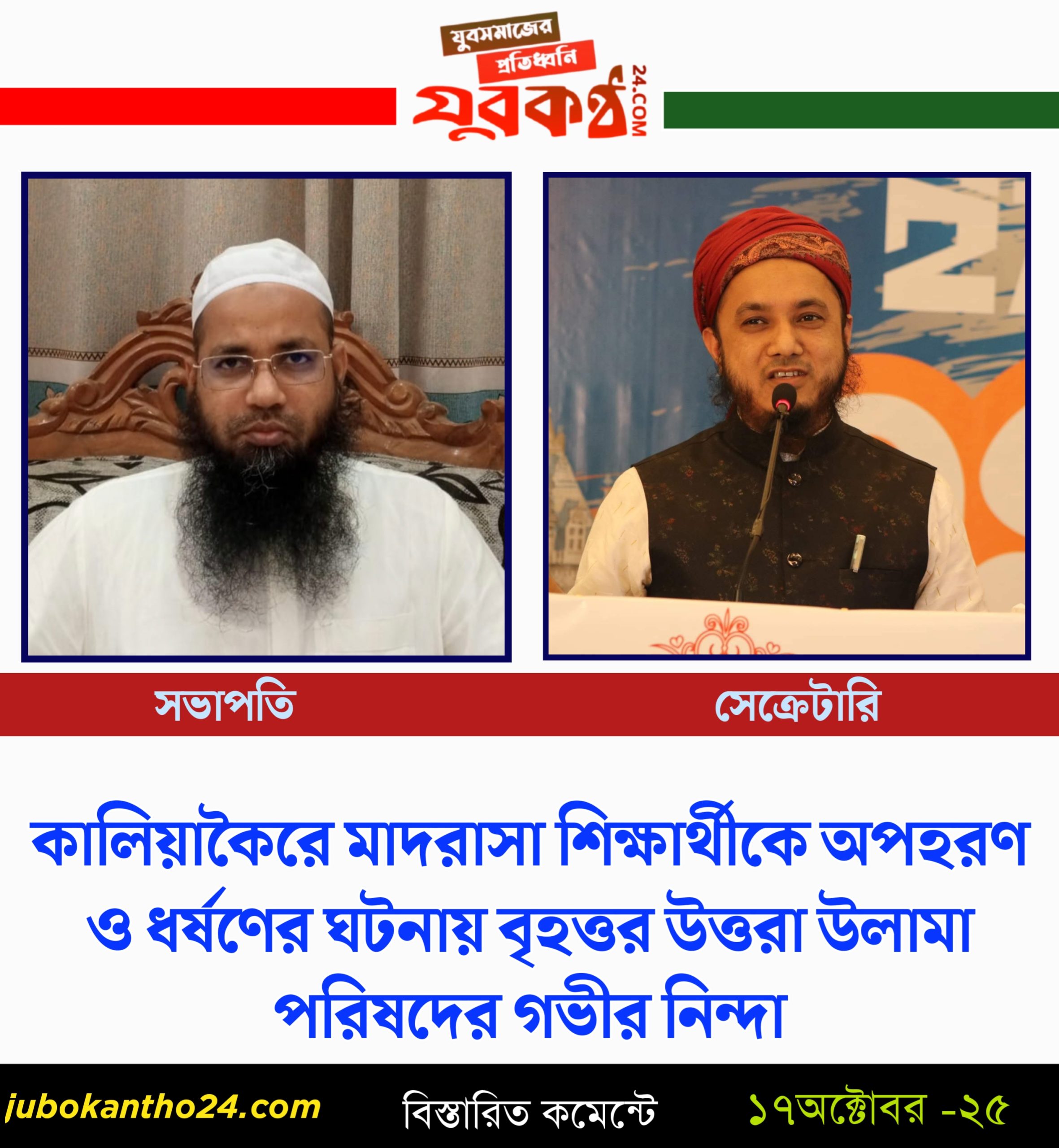 কালিয়াকৈরে মাদরাসা শিক্ষার্থীকে অপহরণ ও ধর্ষণের ঘটনায় বৃহত্তর উত্তরা উলামা পরিষদের গভীর নিন্দা