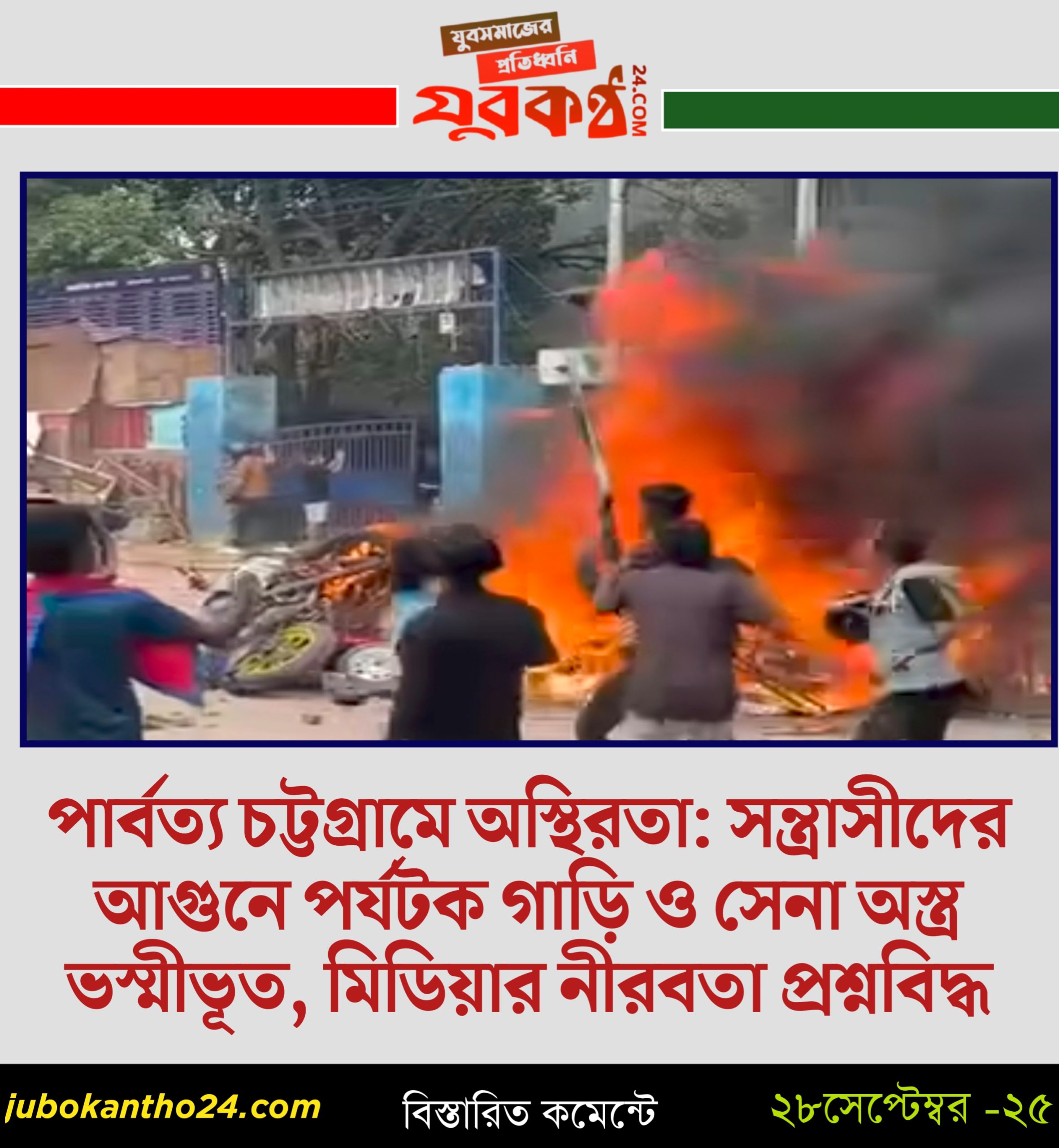 গুরুত্বপুর্ণ নিউজ, জাতীয় পার্বত্য চট্টগ্রামে অস্থিরতা: সন্ত্রাসীদের আগুনে পর্যটক গাড়ি ও সেনা অস্ত্র ভস্মীভূত, মিডিয়ার নীরবতা প্রশ্নবিদ্ধ সেপ্টেম্বর ২৮, ২০২৫