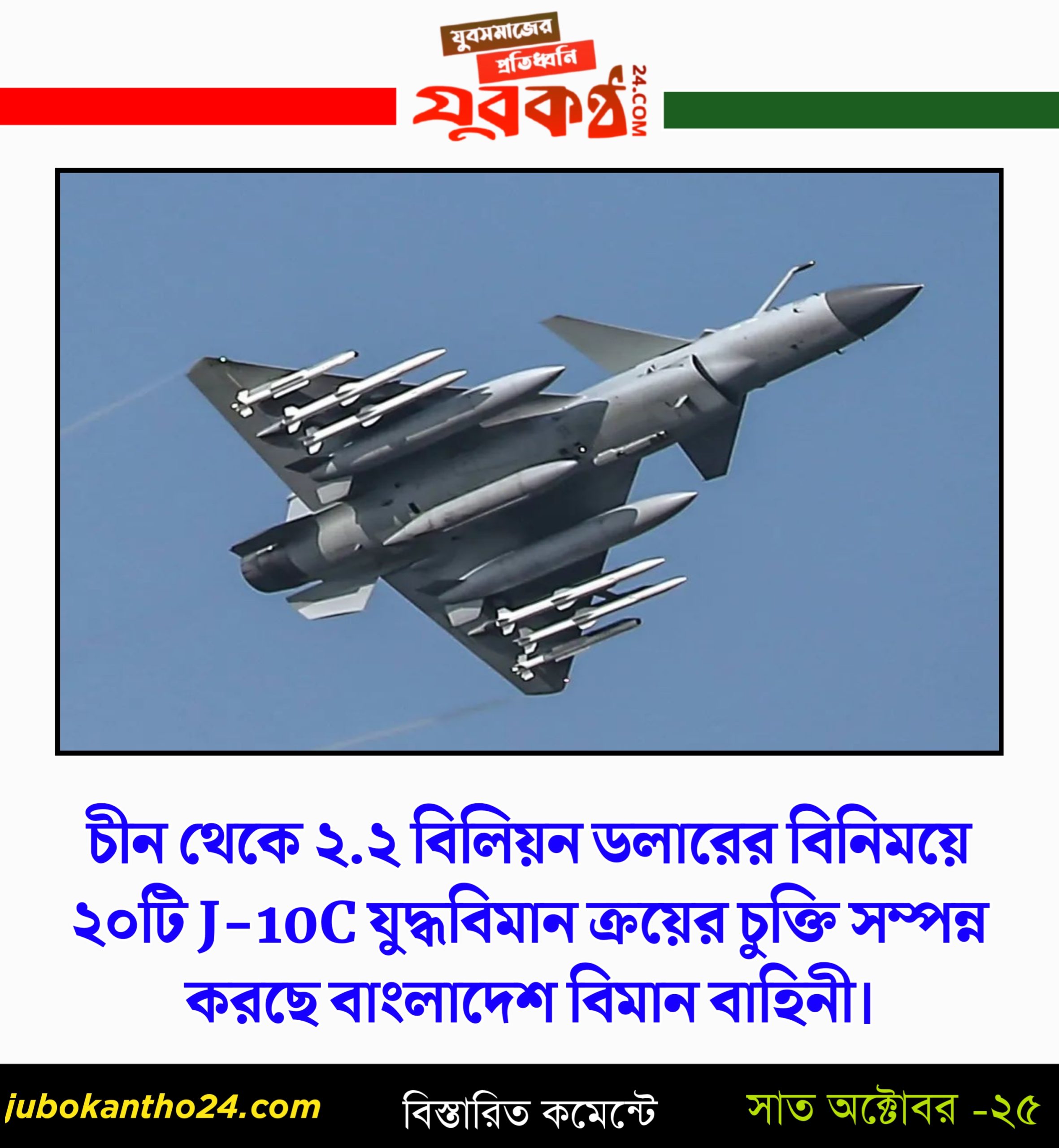 বাংলাদেশ বিমানবাহিনীর জন্য চীন থেকে ২.২ বিলিয়ন ডলার বা ২৭ হাজার ৬০ কোটি টাকার বিনিময়ে ২০টি জে-১০সি যুদ্ধবিমান ক্রয়ের চুক্তি চুড়ান্ত করেছে বাংলাদেশ। ২০২৬-২৭ অর্থবছর থেকে এই চুক্তির আওতায় যুদ্ধ বিমান গুলো ক্রয়,পাইলট প্রশিক্ষণ, মেনটেইন্যান্স শুরু হবে। এবং এর মূল্য পরিশোধের মেয়াদকাল ধরা হয়েছে আগামী ১০ বছর অর্থাৎ ২০৩৫-৩৬ সাল পর্যন্ত।