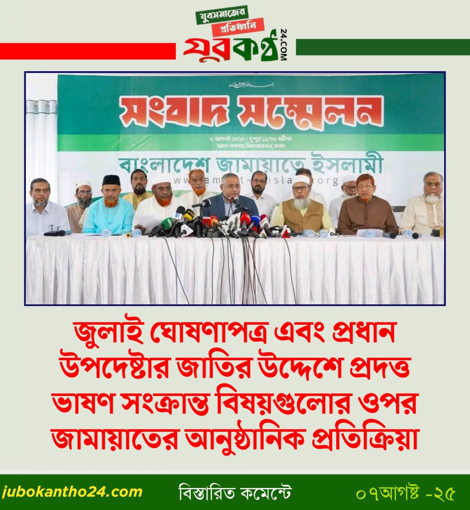 জুলাই ঘোষণাপত্র এবং প্রধান উপদেষ্টার জাতির উদ্দেশে প্রদত্ত ভাষণ সংক্রান্ত বিষয়গুলোর ওপর জামায়াতের আনুষ্ঠানিক প্রতিক্রিয়া
