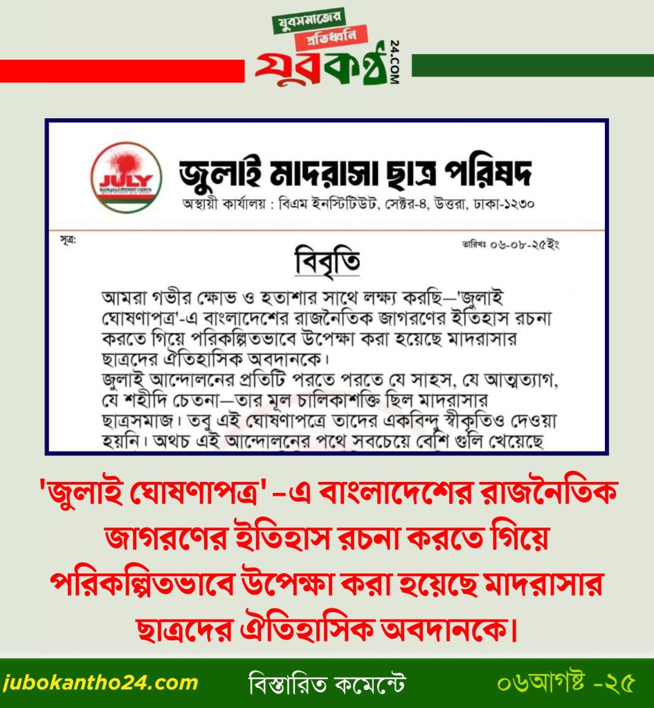 আমরা গভীর ক্ষোভ ও হতাশার সাথে লক্ষ্য করছি—’জুলাই ঘোষণাপত্র’-এ বাংলাদেশের রাজনৈতিক জাগরণের ইতিহাস রচনা করতে গিয়ে পরিকল্পিতভাবে উপেক্ষা করা হয়েছে মাদরাসার ছাত্রদের ঐতিহাসিক অবদানকে।