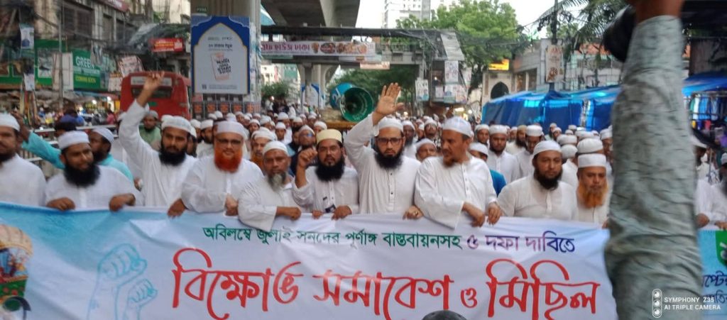 বাংলাদেশ খেলাফত মজলিস ঘোষিত পাঁচ দফা দাবিতে আজ বৃহস্পতিবার বাদ আসর রাজধানীর জাতীয় মসজিদ বাইতুল মোকাররমের উত্তর গেট থেকে ঢাকা মহানগর উত্তর ও দক্ষিণের যৌথ উদ্যোগে এক বিক্ষোভ মিছিল অনুষ্ঠিত হয়।