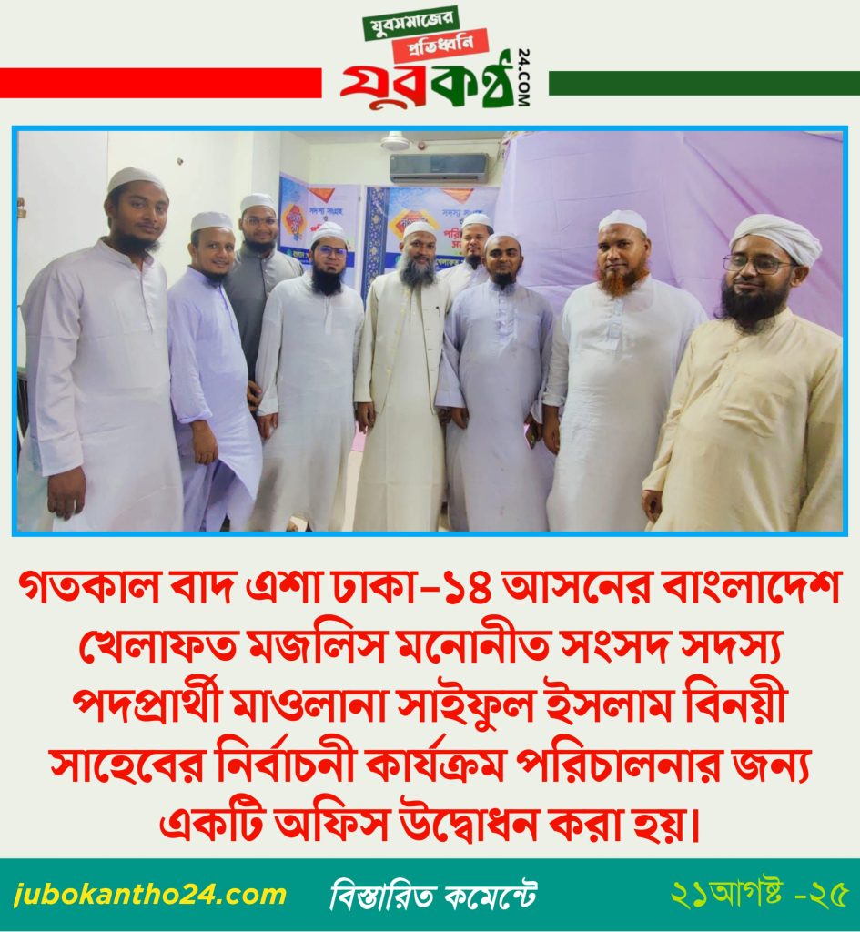 গতকাল বাদ এশা ঢাকা-১৪ আসনের বাংলাদেশ খেলাফত মজলিস মনোনীত সংসদ সদস্য পদপ্রার্থী মাওলানা সাইফুল ইসলাম বিনয়ী সাহেবের নির্বাচনী কার্যক্রম পরিচালনার জন্য একটি অফিস উদ্বোধন করা হয়।