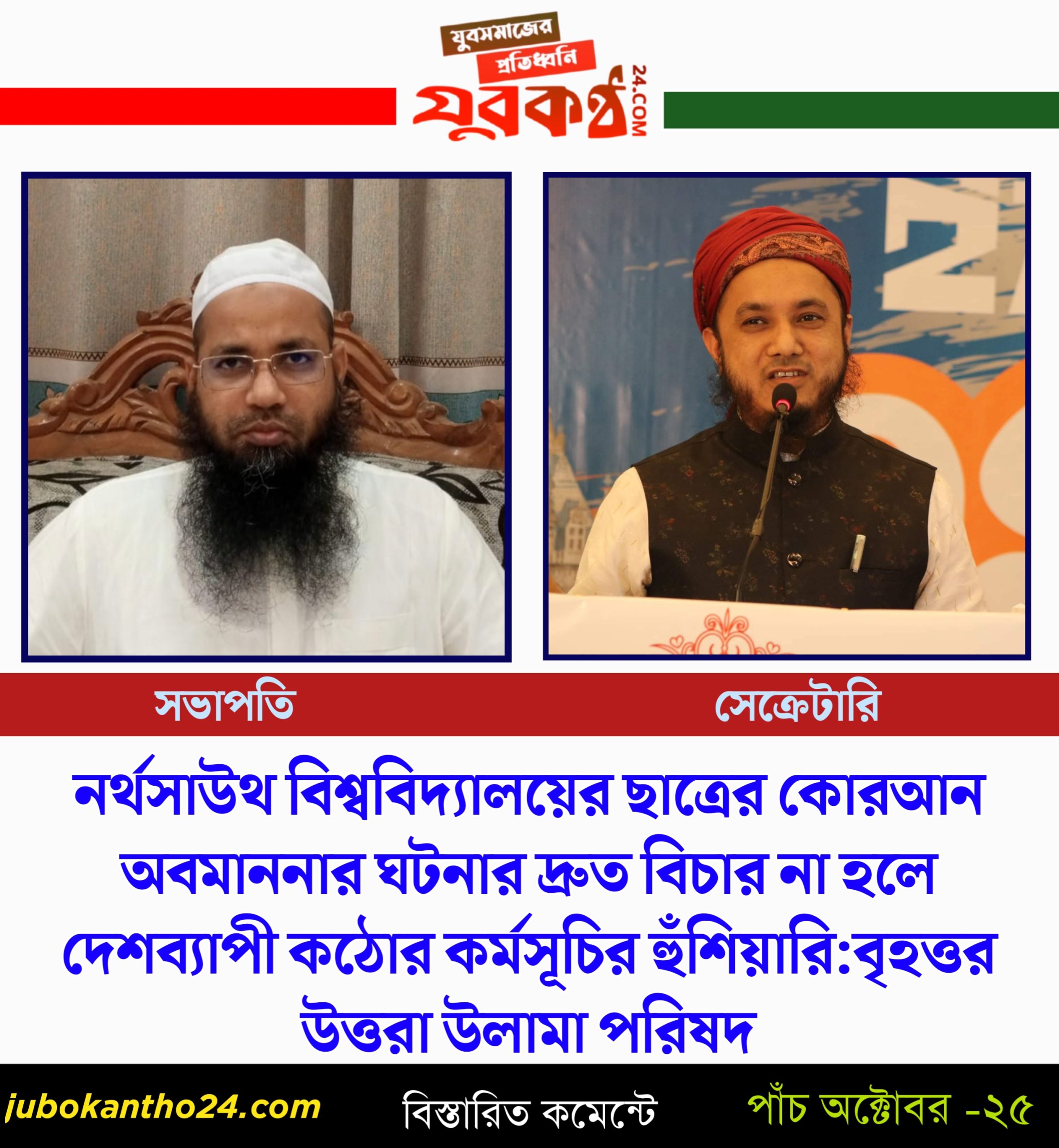 নর্থসাউথ বিশ্ববিদ্যালয়ের ছাত্রের কোরআন অবমাননার ঘটনার দ্রুত বিচার না হলে দেশব্যাপী কঠোর কর্মসূচির হুঁশিয়ারি — বৃহত্তর উত্তরা উলামা পরিষদ