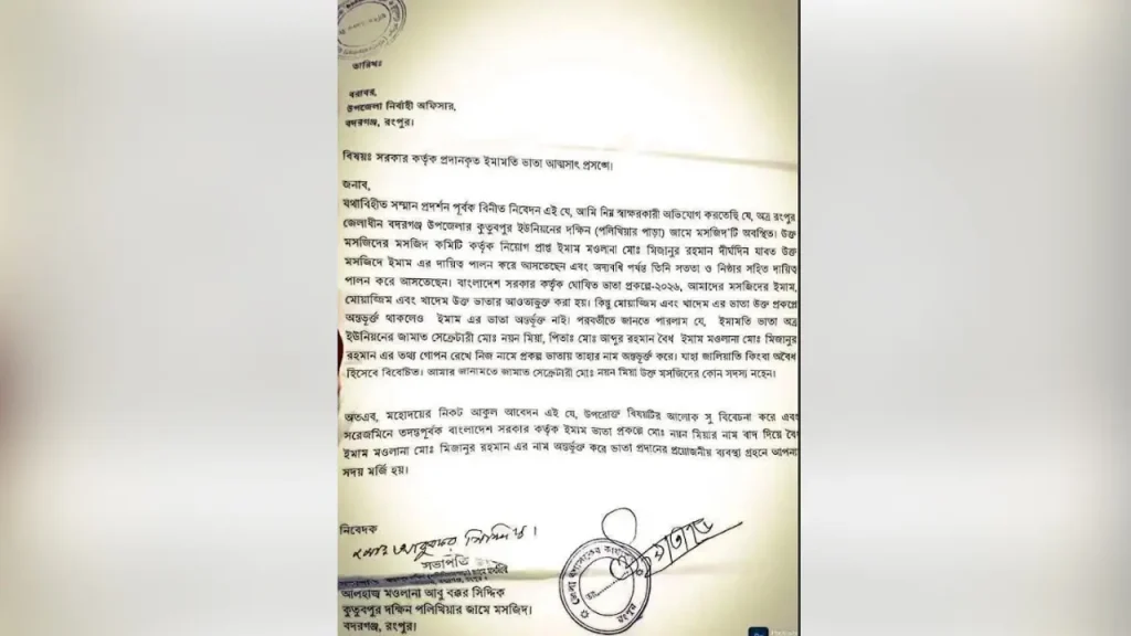 পরে জানা যায়, ওই ভাতা প্রকল্পে ইমামের নামের তথ্য গোপন রেখে ওই ইউনিয়নের জামায়াতে ইসলামীর সেক্রেটারি নয়ন মিয়া জালিয়াতি করে নিজ নাম অন্তর্ভুক্ত করে ভাতার টাকা আত্মসাৎ করেন।