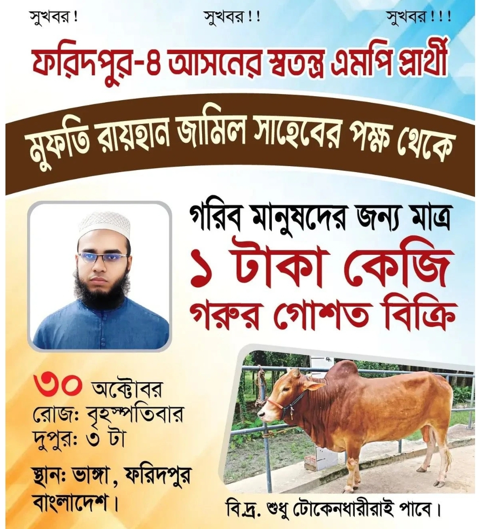 পোস্টারে দেখা যায়, ফরিদপুর-৪ (সদরপুর-ভাঙ্গা-চরভদ্রাসন) আসনের স্বতন্ত্র সংসদ সদস্য প্রার্থী রায়হান জামিলের পক্ষ থেকে (৩০) বৃহস্পতিবার ভঙ্গা উপজেলায় ১টাকায় কেজি গরুর মাংস বিক্রির ঘোষণা দেন।