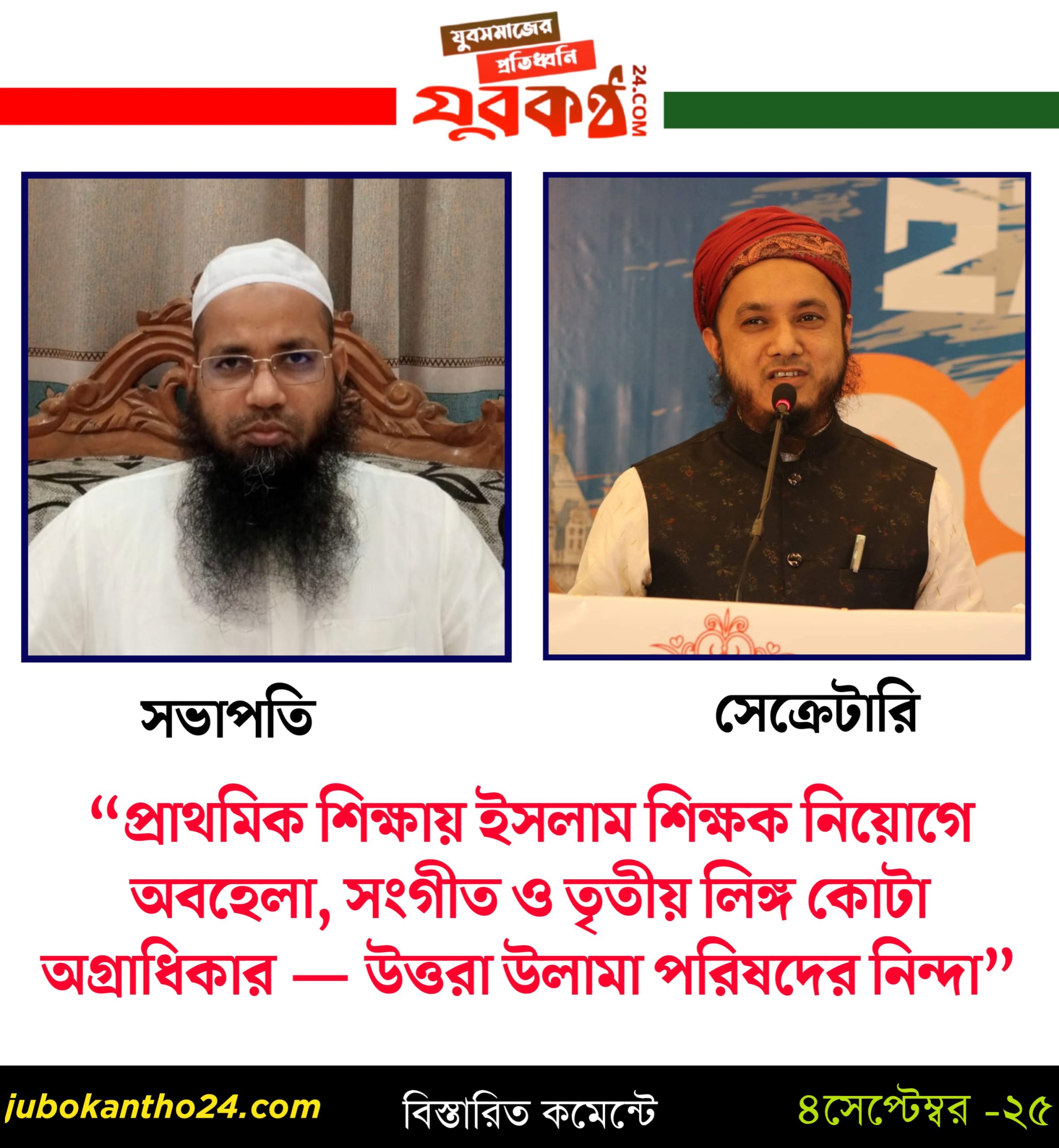 গুরুত্বপুর্ণ নিউজ, জাতীয় “প্রাথমিক শিক্ষায় ইসলাম শিক্ষক নিয়োগে অবহেলা, সংগীত ও তৃতীয় লিঙ্গ কোটা অগ্রাধিকার — উত্তরা উলামা পরিষদের নিন্দা” সেপ্টেম্বর ৩, ২০২৫