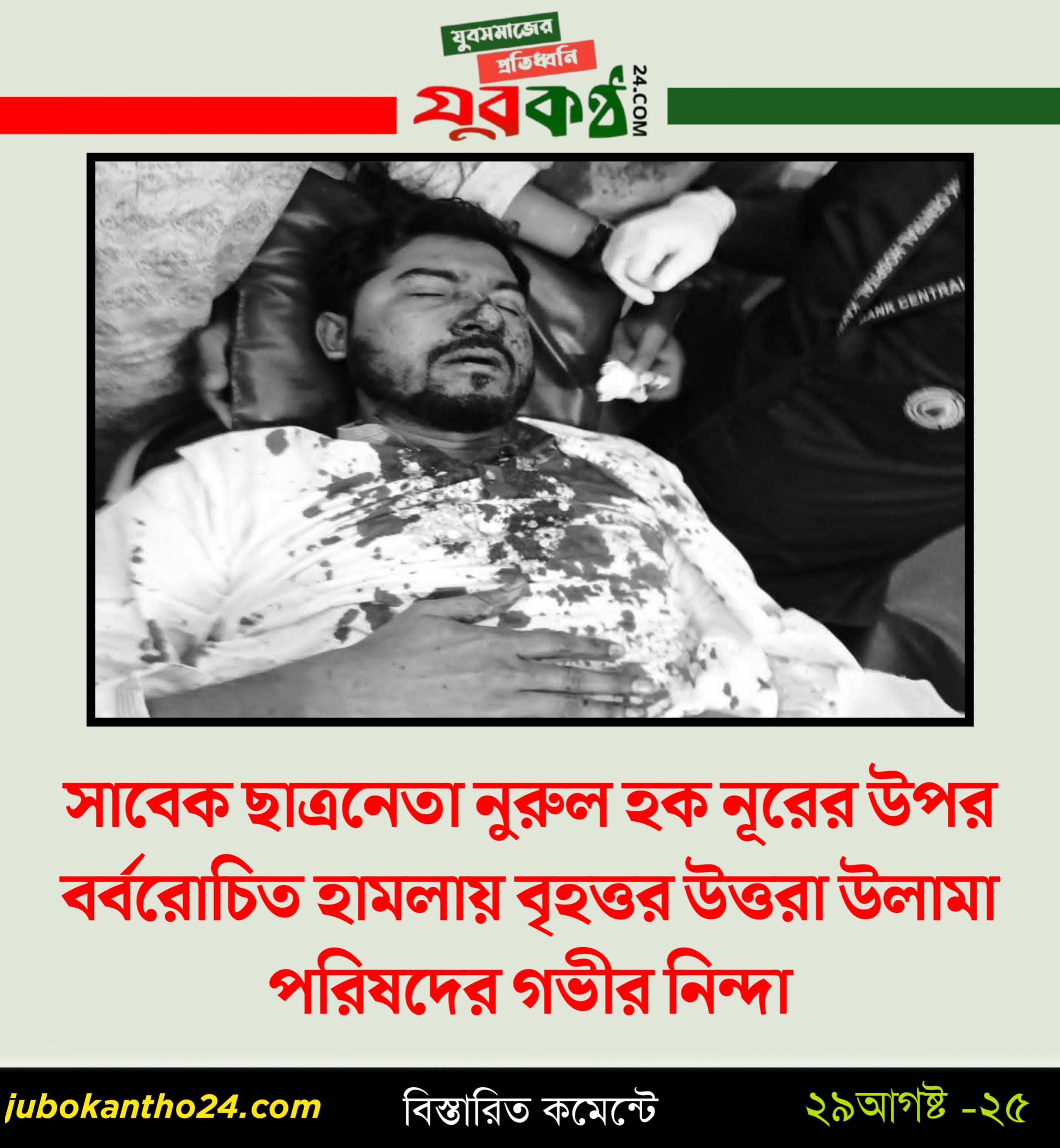 গুরুত্বপুর্ণ নিউজ, জাতীয় সাবেক ছাত্রনেতা নুরুল হক নূরের উপর বর্বরোচিত হামলায় বৃহত্তর উত্তরা উলামা পরিষদের গভীর নিন্দা আগস্ট ২৯, ২০২৫