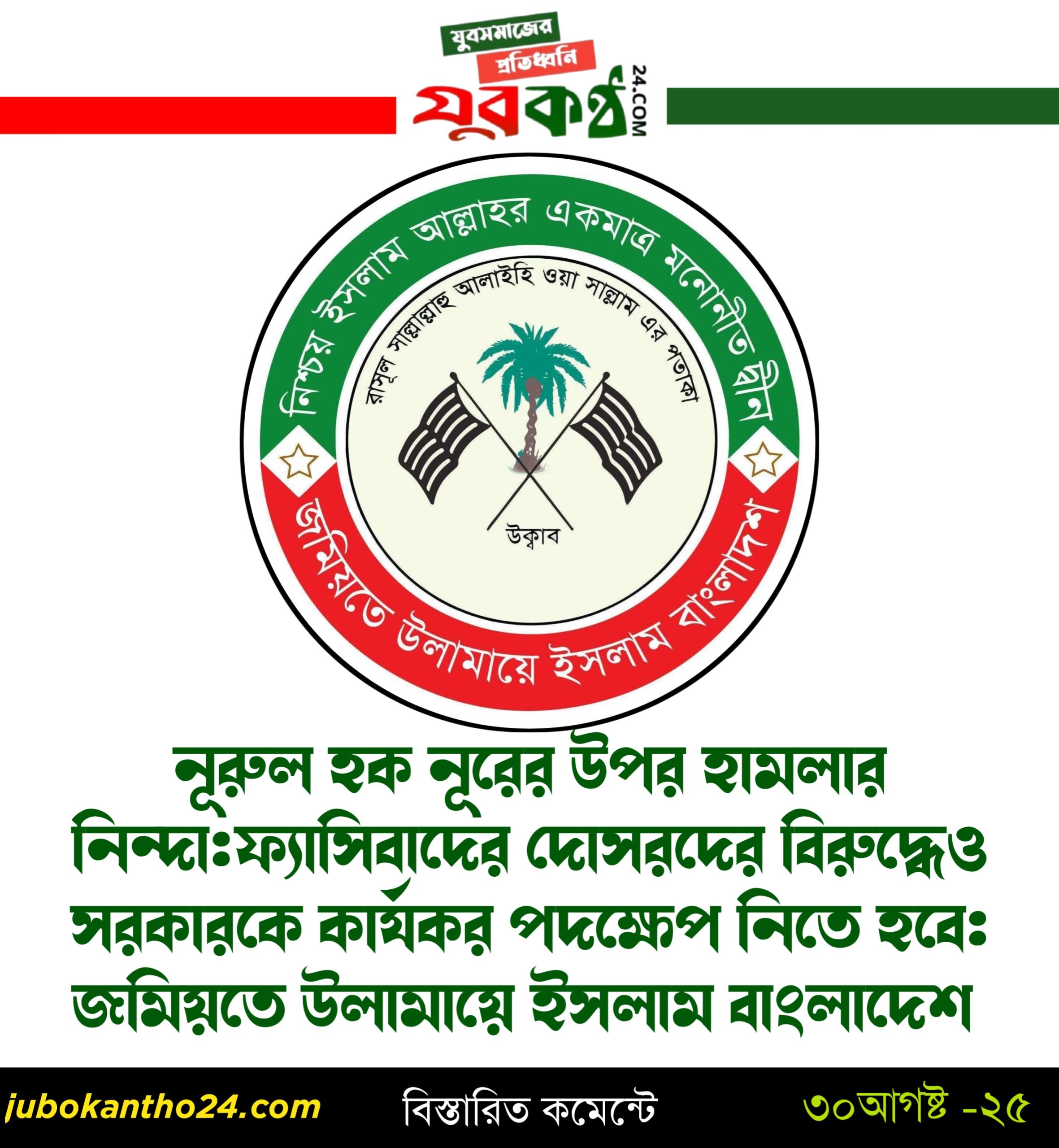 গুরুত্বপুর্ণ নিউজ, জাতীয় নূরুল হক নূরের উপর হামলার নিন্দা: ফ্যাসিবাদের দোসরদের বিরুদ্ধেও সরকারকে কার্যকর পদক্ষেপ নিতে হবে: -জমিয়তে উলামায়ে ইসলাম বাংলাদেশ আগস্ট ২৯, ২০২৫